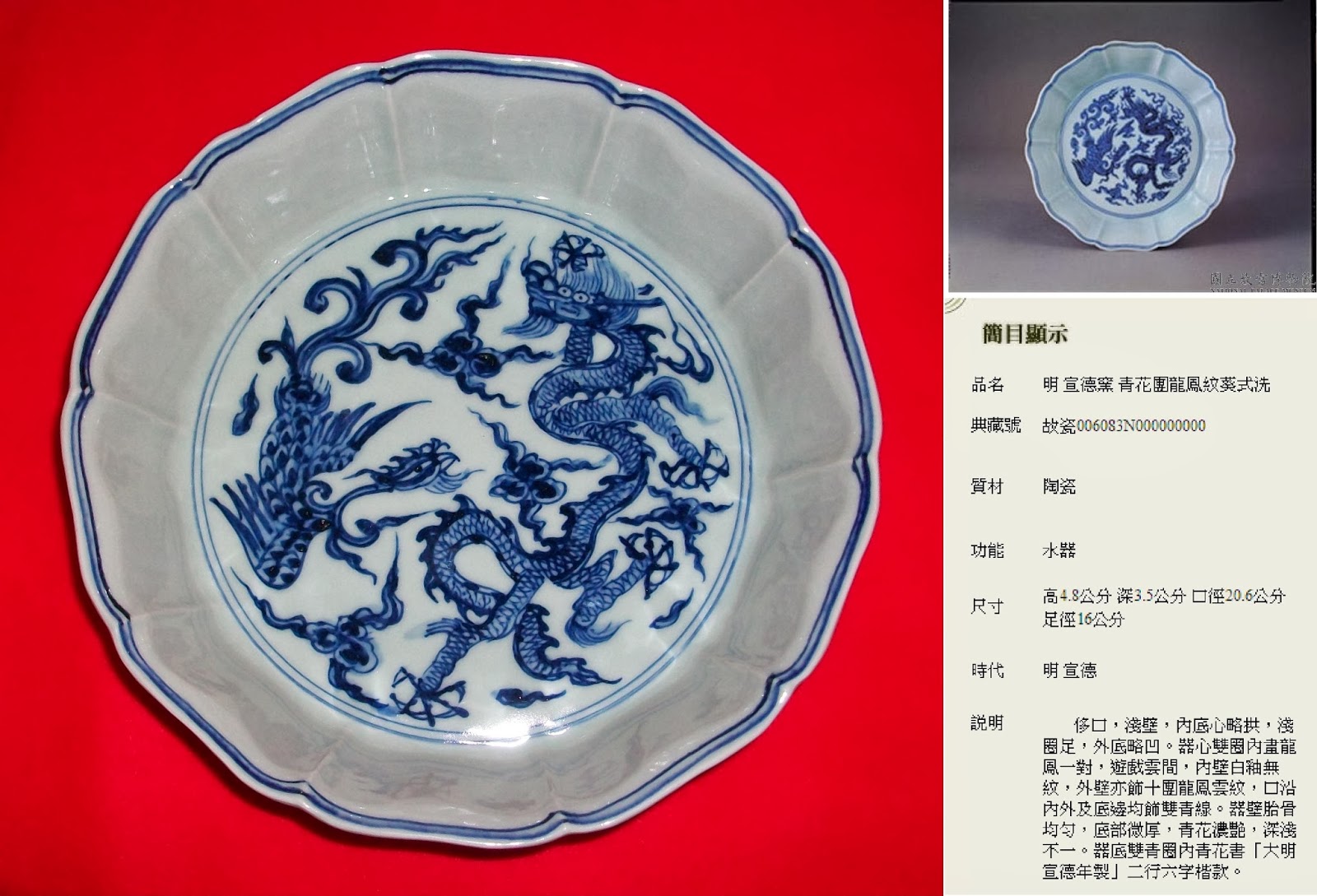 撇口,淺弧壁,矮圈足。盤心內凹外凸,畫一張口、吐舌、露齒、舞爪的游龍與戲鳳,隙地則飾以纏枝蓮花卉紋。外壁則分別以深青繪飾游龍與戲鳳,其隙地亦飾以纏枝蓮花卉紋。內外壁加飾青線圈八道。胎骨均勻,釉色青白暈散艷麗,白胎細膩堅緻。底書「大明宣德年製」二行六字楷款,外加雙圈。