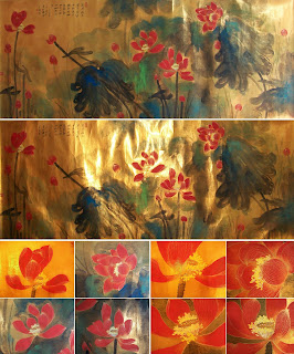 32. Zhang Daqian Splashed Color Golden Outlined Red Lotus on Gold Sheet 張大千作金箋潑彩描金紅荷花圖