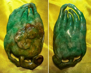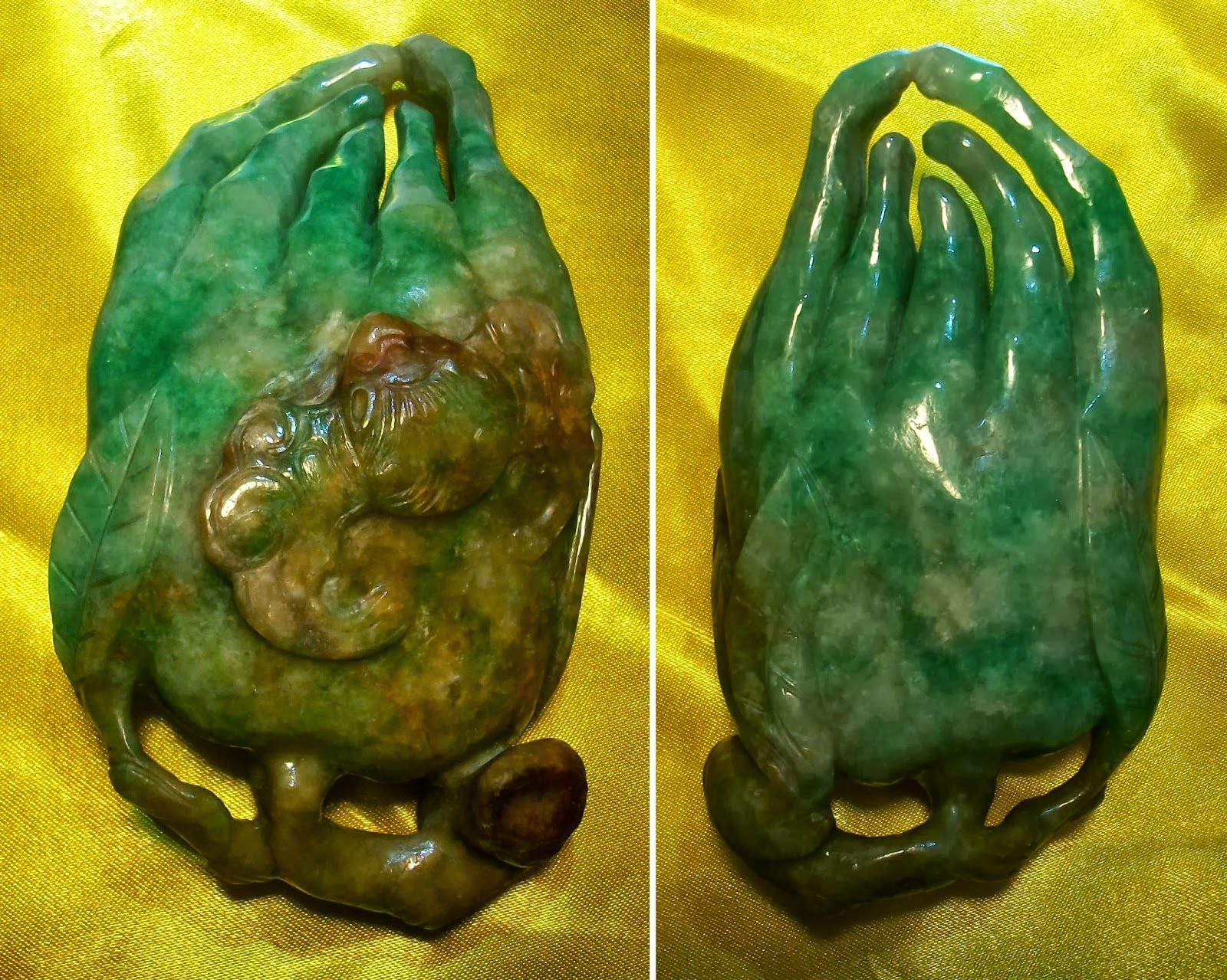 Green Purple Red Three-Colored Jadeite Carved Happy Hand Auspicious Bat Longevity Fungus “Happiness Wealth and Longevity Buddhist Hand” Qing Dynasty