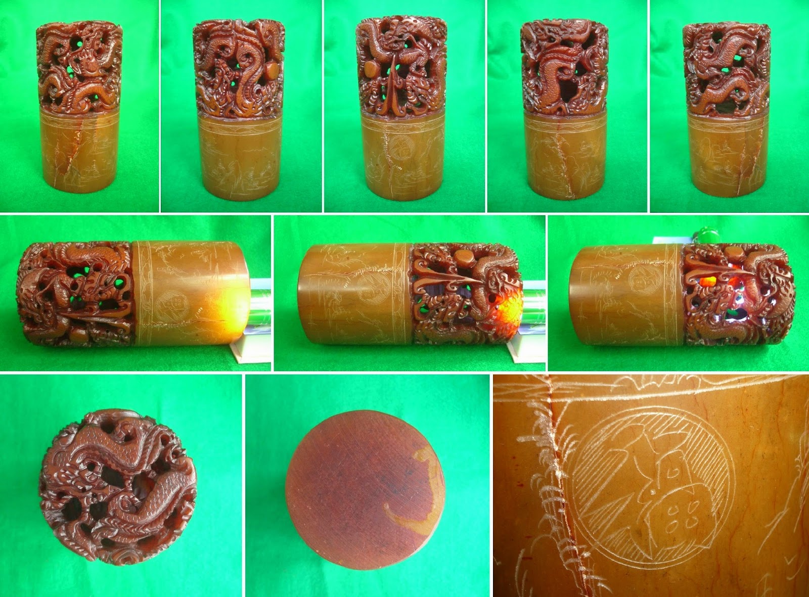 本件田黃石具備有蘿卜紋、紅血絲筋紋、裂格紋、燈照半透明並出現紅黃寶光、手摸有滑腻感、表面油脂光泽等天然田黃石的特徵。