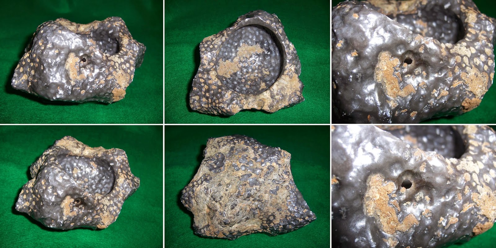 This meteorite is a Space-Vessel-Egg-Shell-like object with the following features like Density (Specific Gravity) 2.61 - 2.69, no metal flakes and elements as well as no magnet test effect (such as Martian Meteorite), no irons and no nickels, unnaturally dense and much heavier feeling in the hand than an ordinary earth rock, darker fusion crust on the surface than the terrestrial rocks, thumbprints (Regmaglypts) on both inner and outer layers, flow lines (tiny melted rivulets) on thumbprints area, one atmosphere burning penetrating hole with naturally melted hole edge skin, heading dome shape and trailing round egg shell concave tail end hole (being projected directly toward the earth and dropped vertically without rolling to land), no vesicles of earth volcanic rock pumice, no transparency and fragility of Obsidian (Volcanic glass with density 2.339-2.527) and Tektite (Moldavite, Australites, Indochinites,…etc with density 2.34-2.51), unknown extraterrestrial materials with unknown composition that do not exist in our planet.