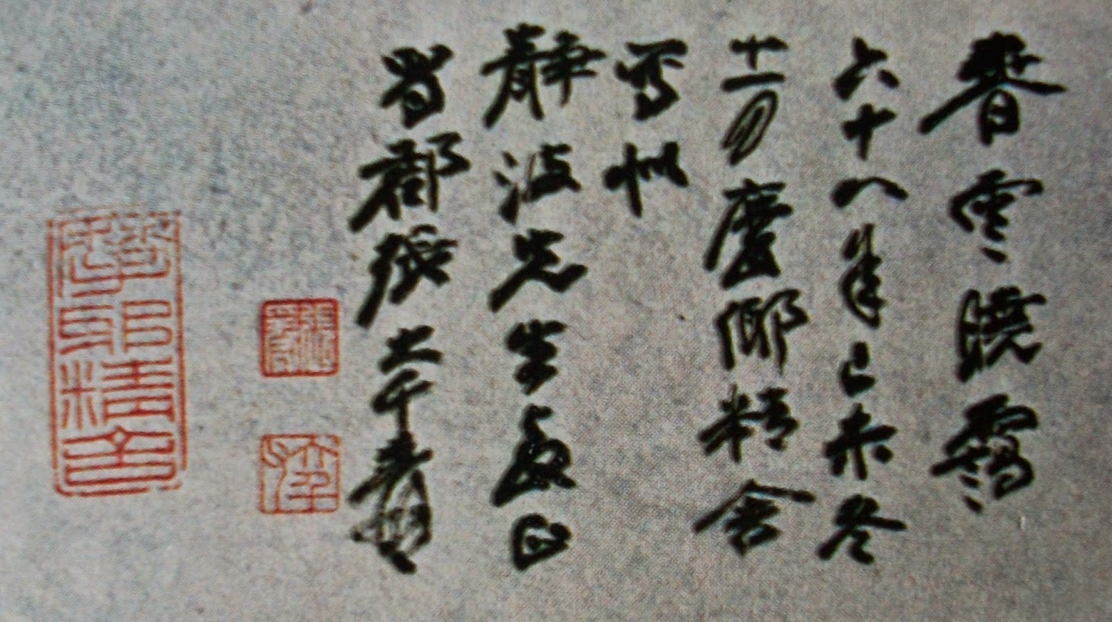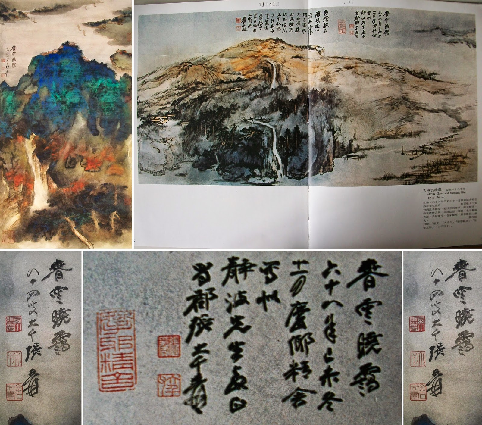 The four-character handwriting title "Spring Cloud and Morning Mist" of this painting is the same as that four-character handwriting title "Spring Cloud and Morning Mist" in the "Spring Cloud and Morning Mist" painting dedicated to Mr. Yan Jiagan who had been just retired from his 5th Presidency of Republic Of China and succeeded the Chairman of Governing Association of National Palace Museum Taipei Taiwan by Zhang Daqian dated Nov. 1979, H69 x W176 cm, Literature: "Paintings of Zhang Daqian Volume 2", Page 8-9, Picture 2, published by Museum of History Taipei Taiwan in Dec. 1980.