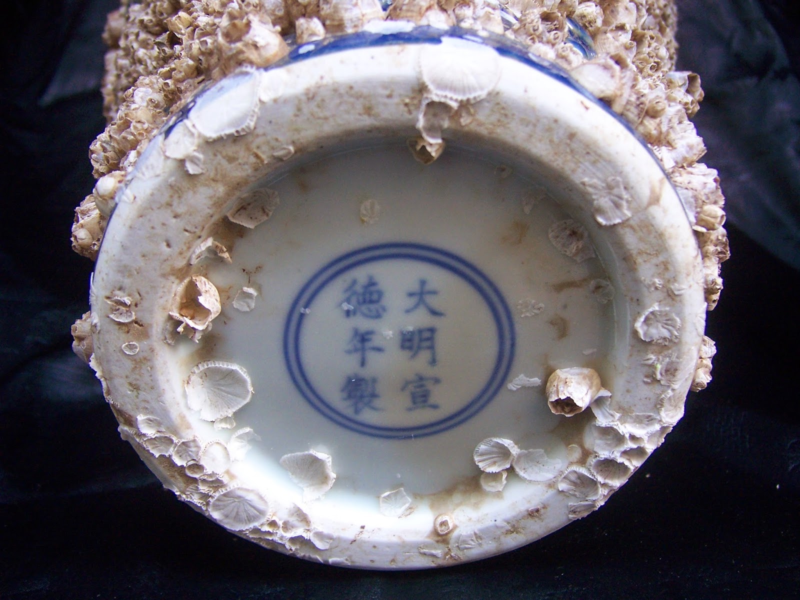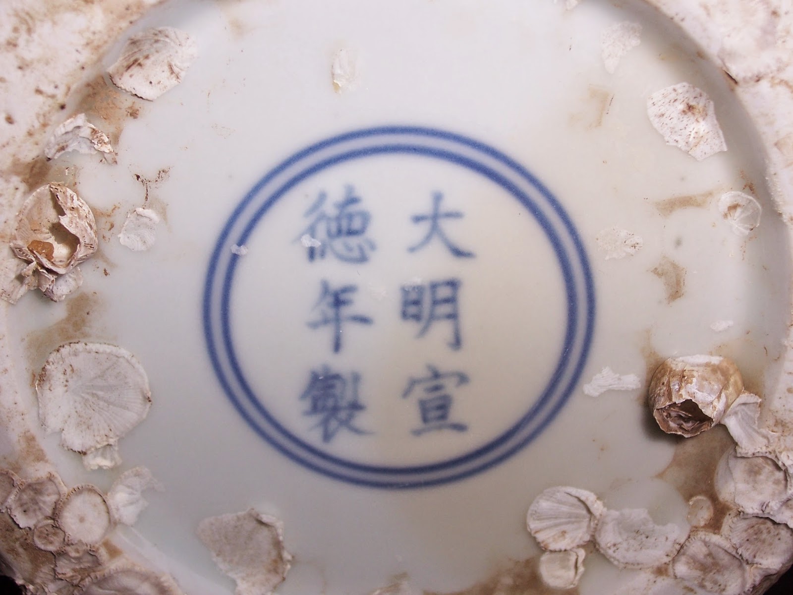 The Chinese Fine Ceramics hidden in the seabed sludge are completely isolated from the air as if they were placed in a time capsule. So long as their seabed sludge on the surface of ceramic body is scrubbed clean, then to soak them in the fresh water and to wash away the parasitic sea crustacean organism off the surface of porcelain with soft brush, they look brand-new as it were just burnt out of the kiln several hundreds of years ago. The ceramics from the Imperial Palace Workshop were all made firm and rigid. The sea tides and waves are not easily to destroy them in the sea. Therefore, they provide the most accurate information to the proper generation database of parameters such as porcelain, clay, glaze surface, color material, ornamentation, bubbles, construction method, burning method, flint fire-burnt red, crackles, inscription, basement at bottom, inner wall, year,...... etc, and to master these correct historical data is tantamount to have a relevant authentication knowledge to identify true ceramics at the time when they were just burnt good out of the kiln even if modern people are completely unable to return to the past several hundreds of years ago.