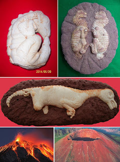 The four feet of this baby dinosaur were running for surviving from perils. It should have been suddenly covered by the volcanic ash at so high as 300 degrees centigrade thermometer from the volcanic eruption and its skin was carbonized as the 20 victim-citizen-bodies in Pompeii Italy during the great Mount Vesuvius volcanic eruption. It was further calcified after several ten or hundred millions years and became a white calcified body.