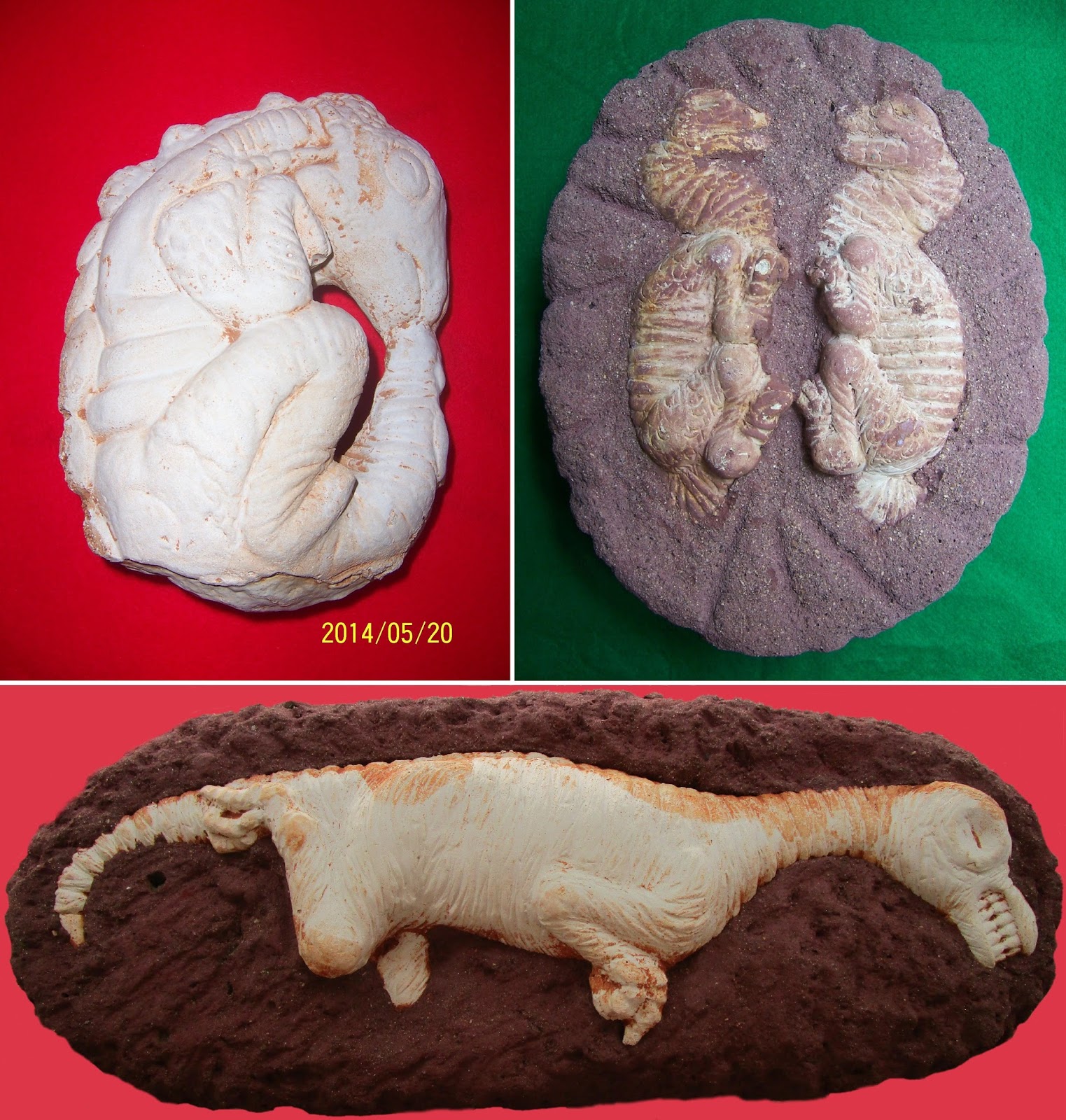 最新發現保存良好的火山岩中白色鈣化恐龍胚胎化石的形狀證明陸上生活的巨大恐龍也應是胎生! 它不是卵形出於蛋中. 它是一個從母恐龍子宮內出生的胚胎.