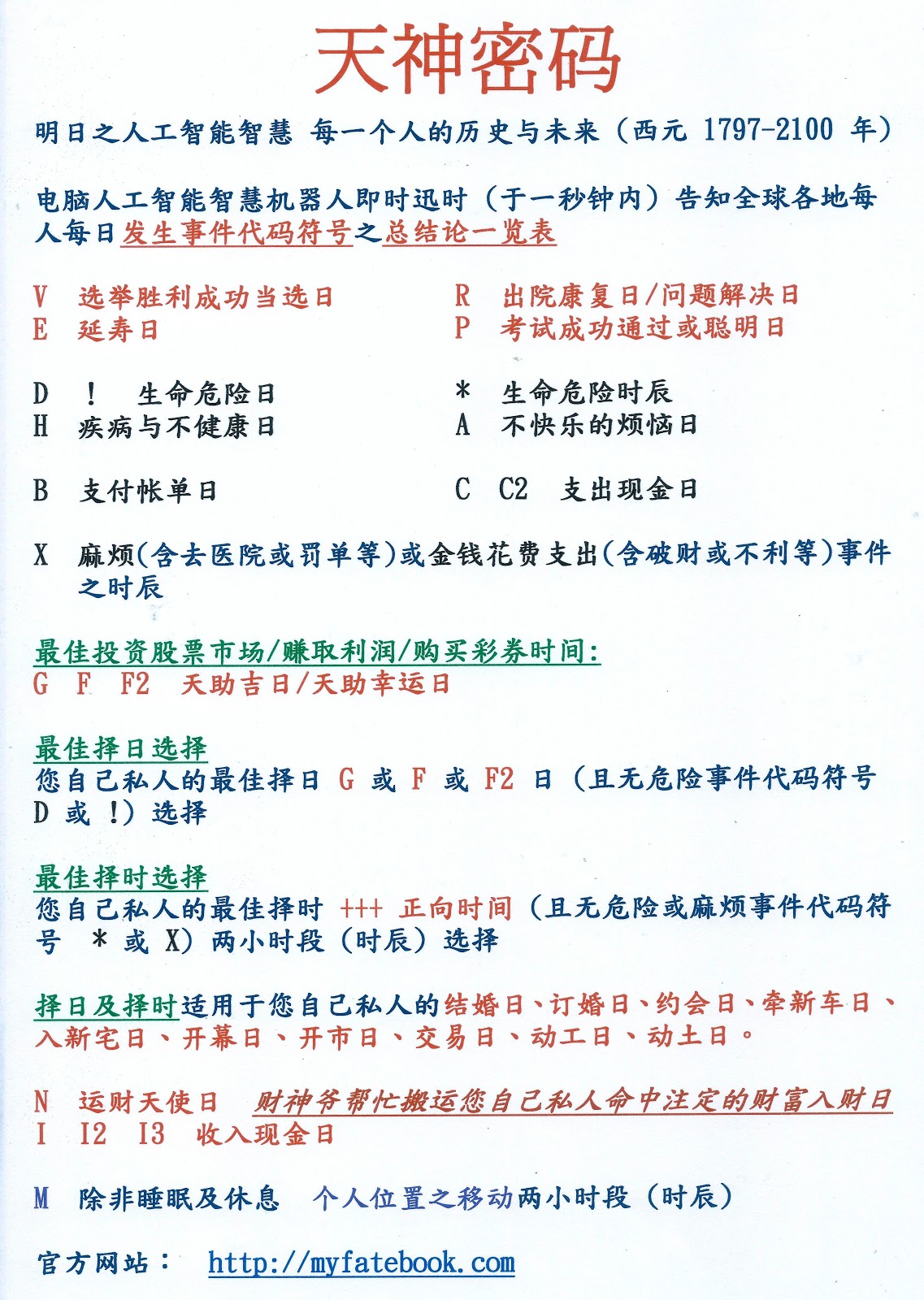 電腦人工智能智慧機器人即時迅時 (於一秒鐘內) 告知全球各地每人每日發生事件代碼符號之總結論一覽表